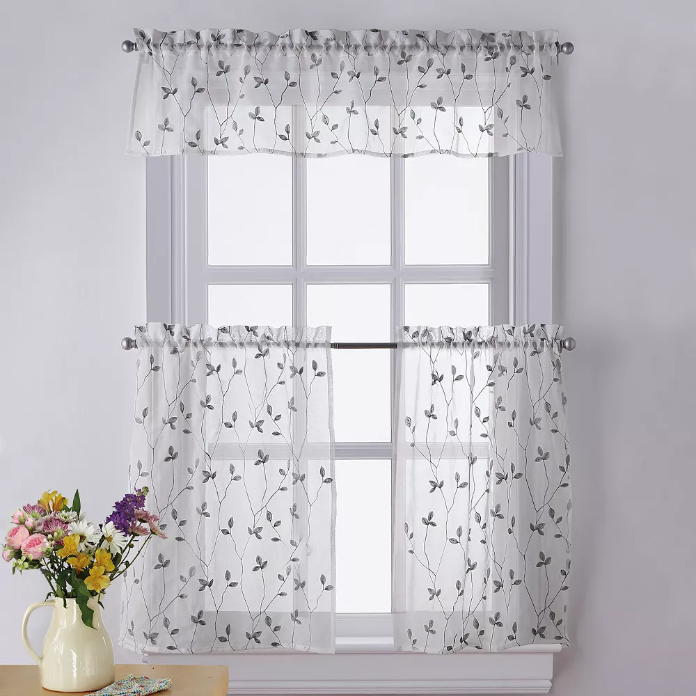 - The Botanical Embroidery valance and tiers feature an allover floral design printed on polyester fabric.
