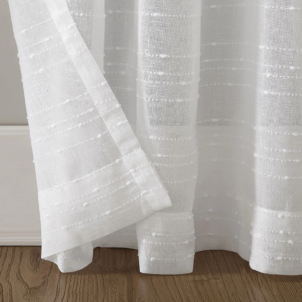 - Subtle stripe design on a slub textured linen blend semi-sheer fabric