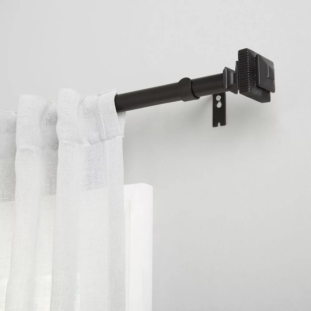 - This adjustable length curtain rod extends and can accommodate a range of window widths.