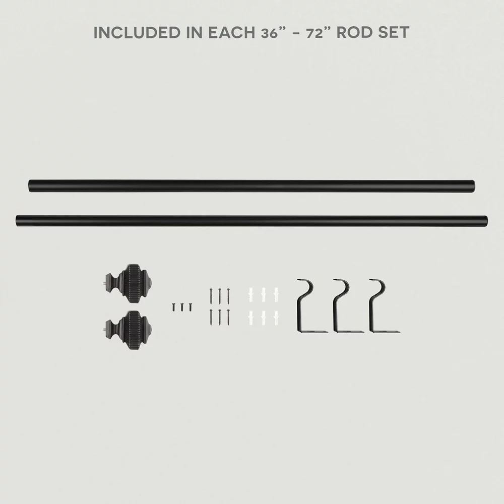 - Includes one adjustable curtain rod in three parts, two finials, three fixed 4” depth projection brackets, and installation hardware with instructions.