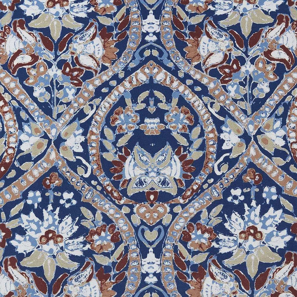 - Features ogee and floral damask prints in rust, gold, and blue
