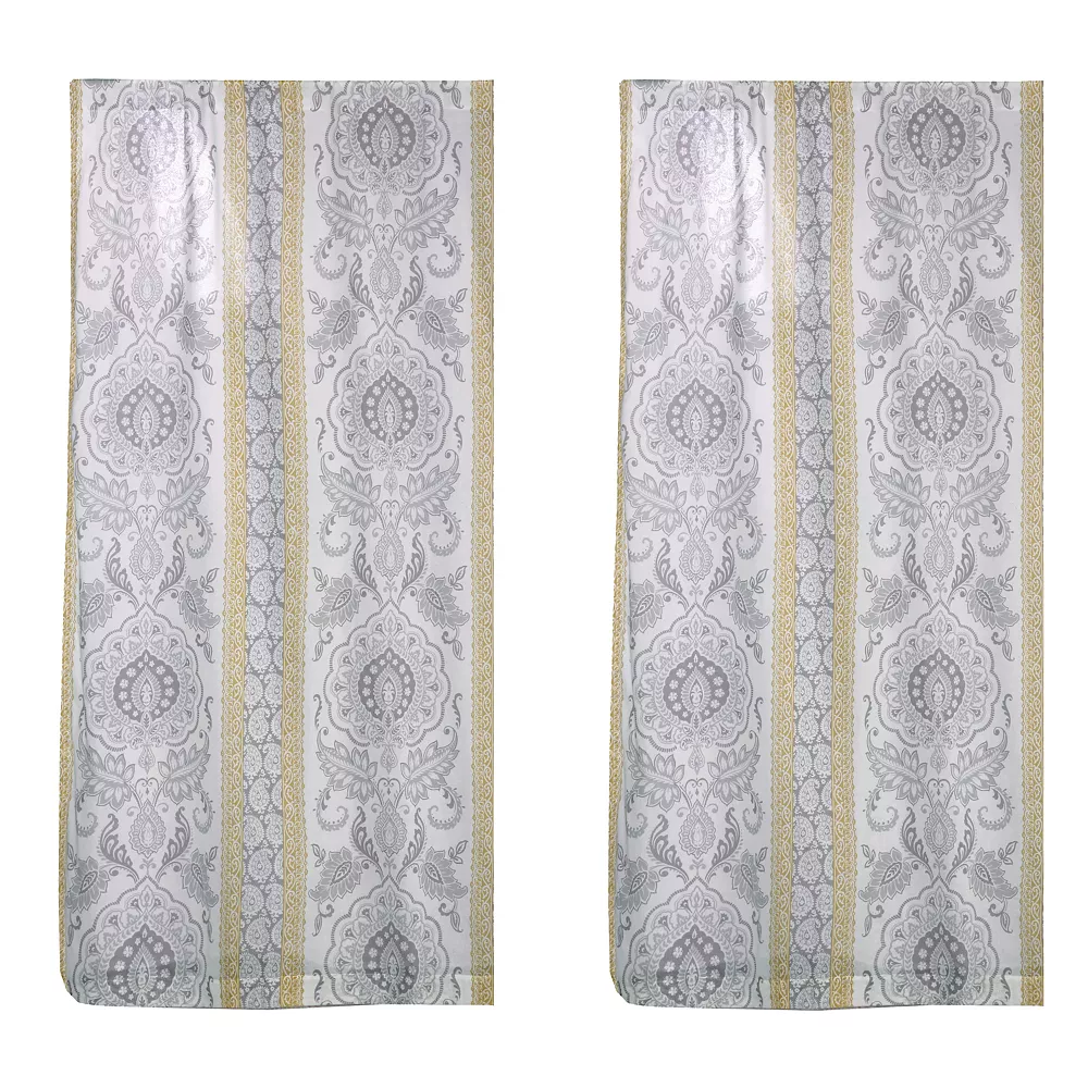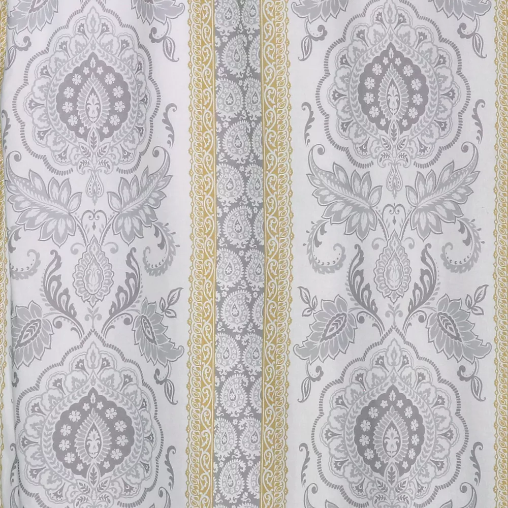- Features a collection of medallions and paisleys in gray and yellow expressed as a repeating stripe pattern