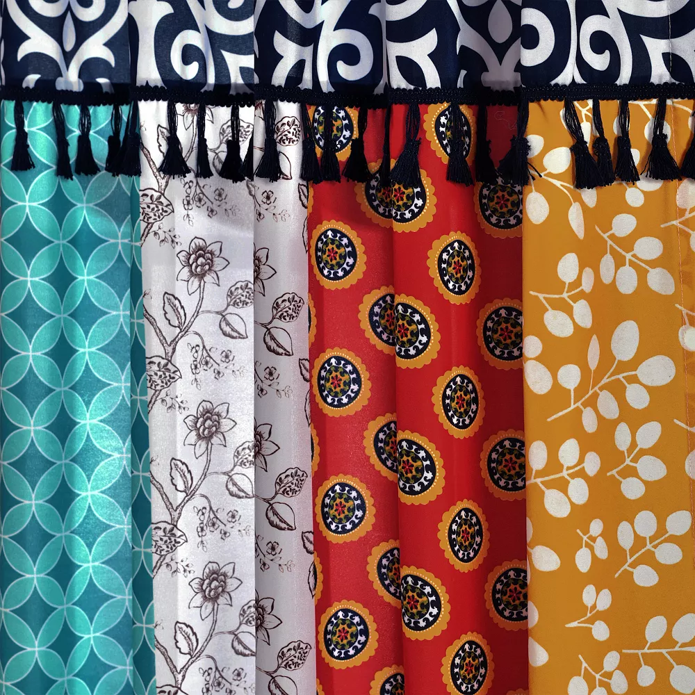 - These bohemian style curtains will brighten your home and your mood. The patchwork style columns of colorful floral and geometric patterns are printed on fabric that allows natural light into the room. Tassels run across the top portion of each panel.