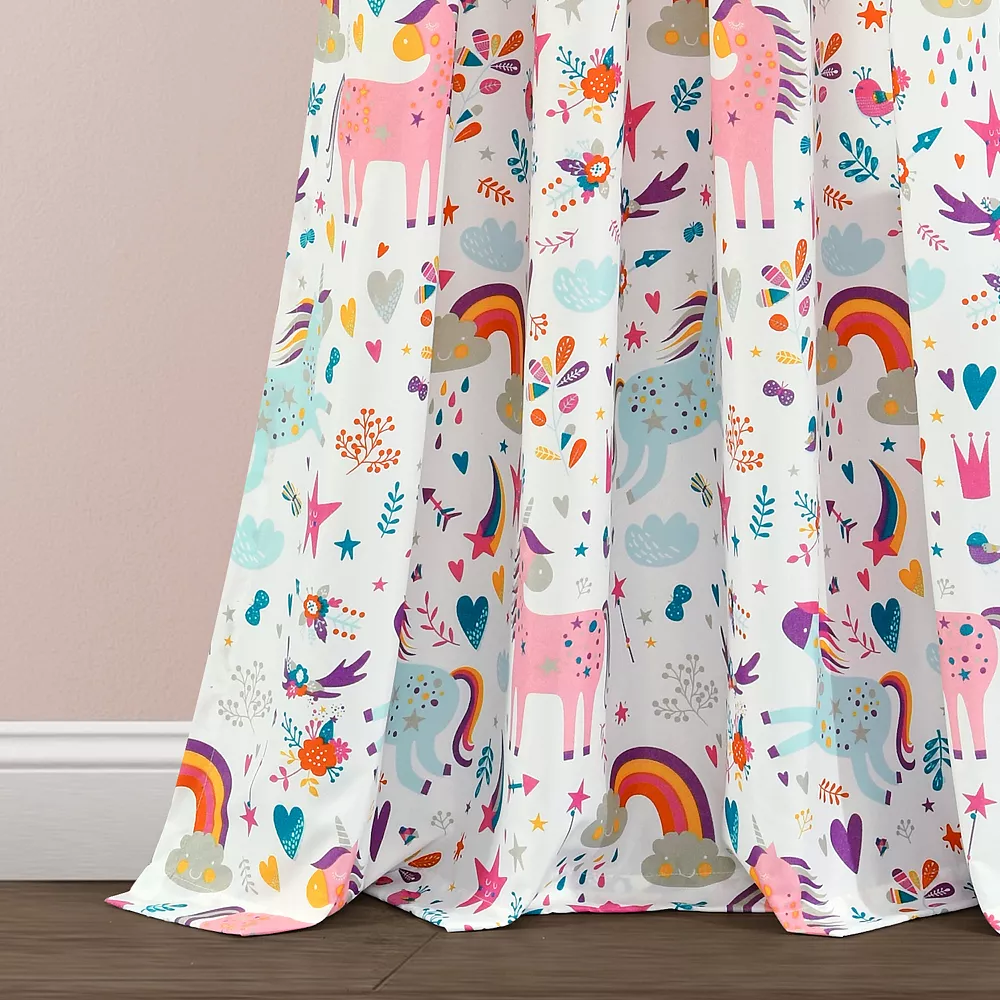- Update your child’s bedroom with this bright and colorful window curtain set featuring a fun print of unicorns, rainbows, shooting stars, hearts and more. These curtains are perfect for your school age child’s big kid bedroom makeover.
