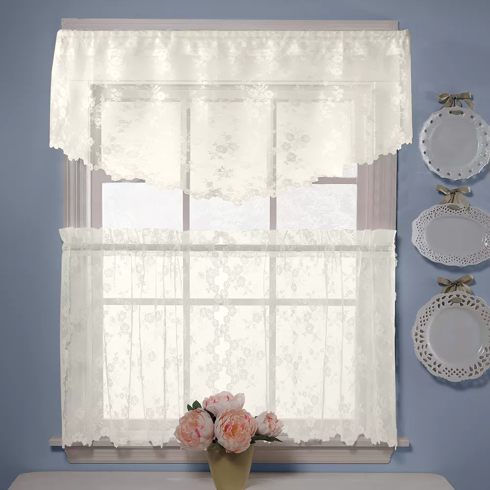 This Petite Fleur valance lends delicate style to your home. The floral pattern and lace design add romantic touches to your kitchen, bedroom or living area. Take your decor to the next level with this window valance.