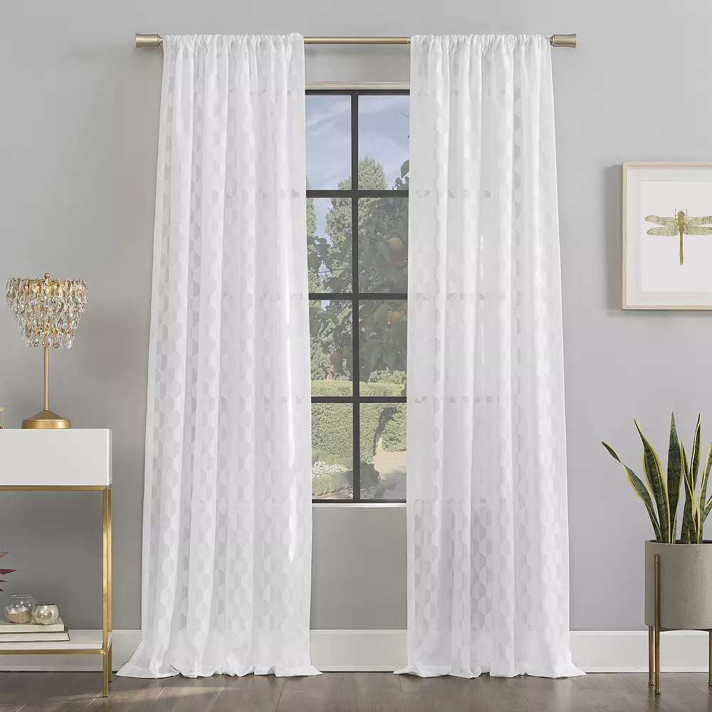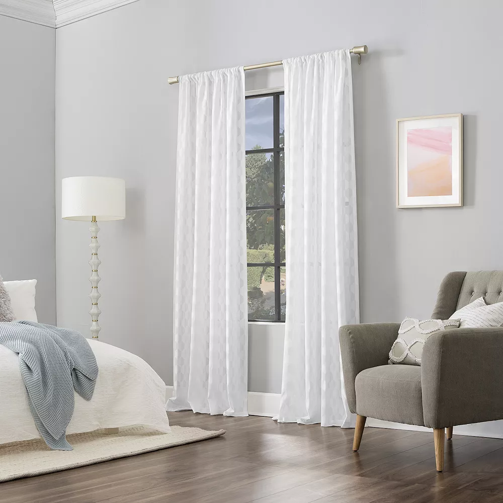 - Geometric woven jacquard design adds distinction to your space. Light and airy sheer fabric embraces light while enhancing privacy. Rod pocket top treatment fits curtain rods up to 1 ½” in diameter; rod not included.