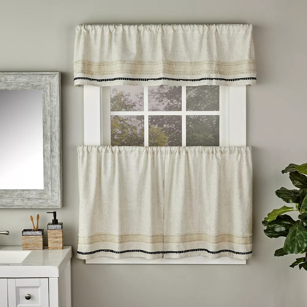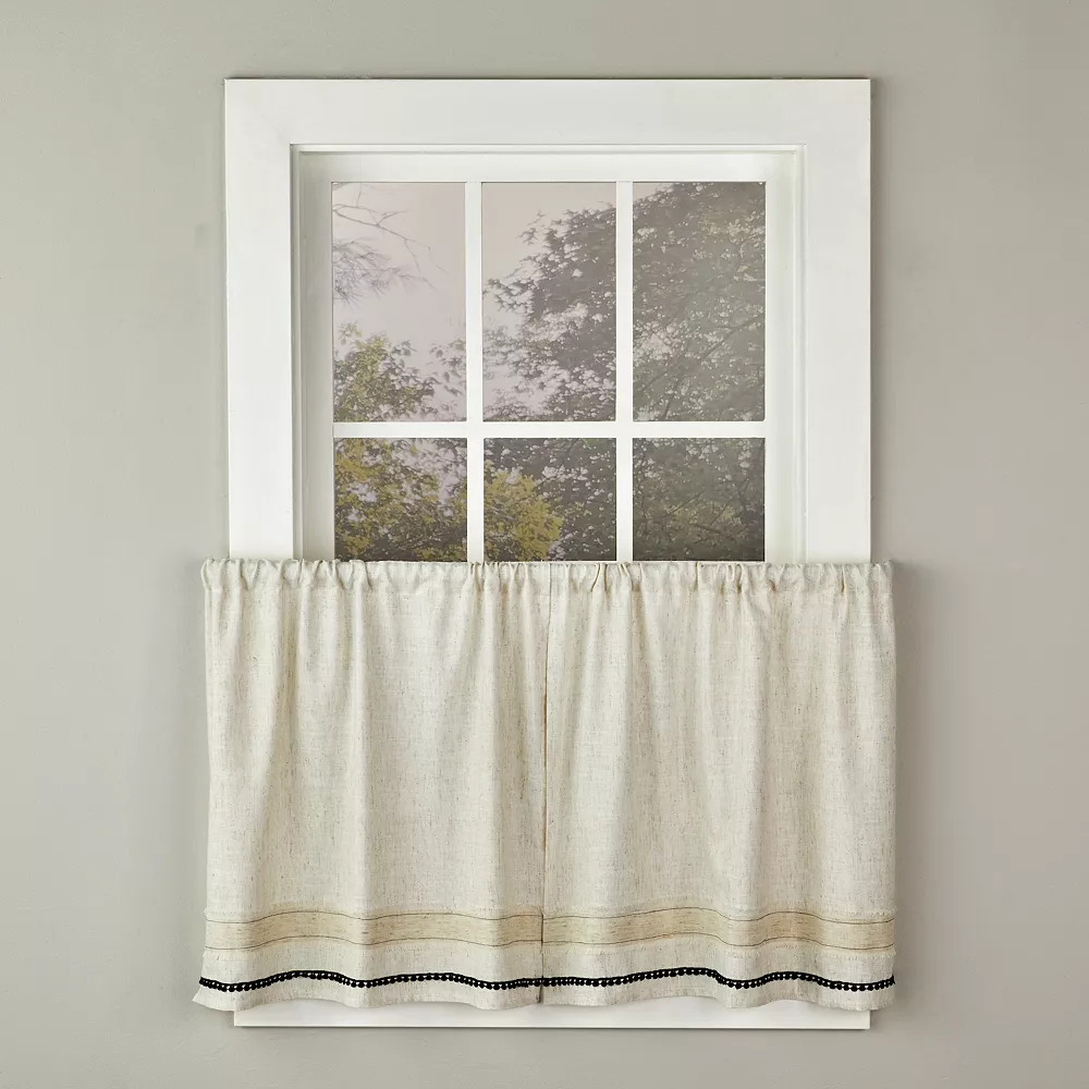 - Lightweight linen-blend fabric with deep, dark navy pom pom trim and frayed trim
