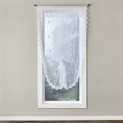 - Lovely in lace. The Jacquelyn shade is featured in sheer lace with a beautiful design, scalloped hem and adjustable ribbon trim in center. Simply pull up the ribbon to adjust the length of the shade. Top rod pocket fits rods up to 0.75″ in diameter.