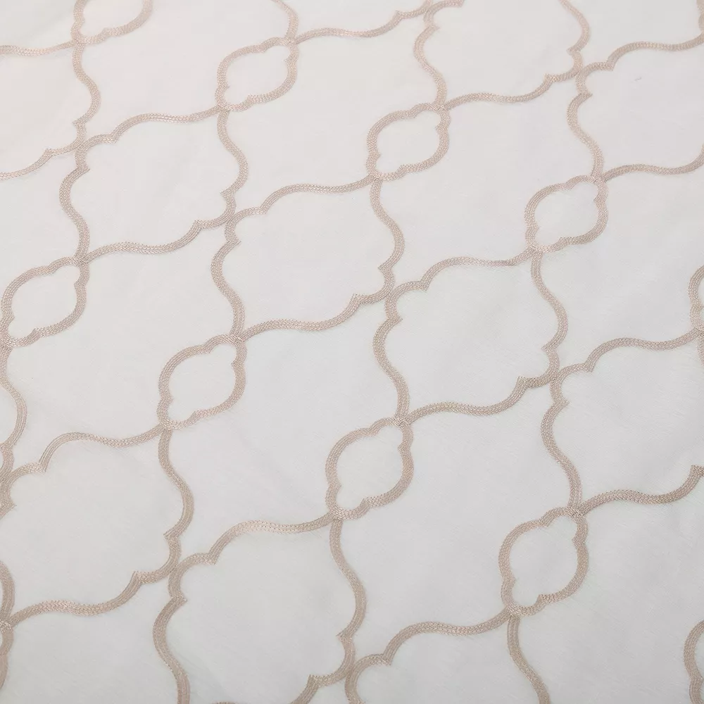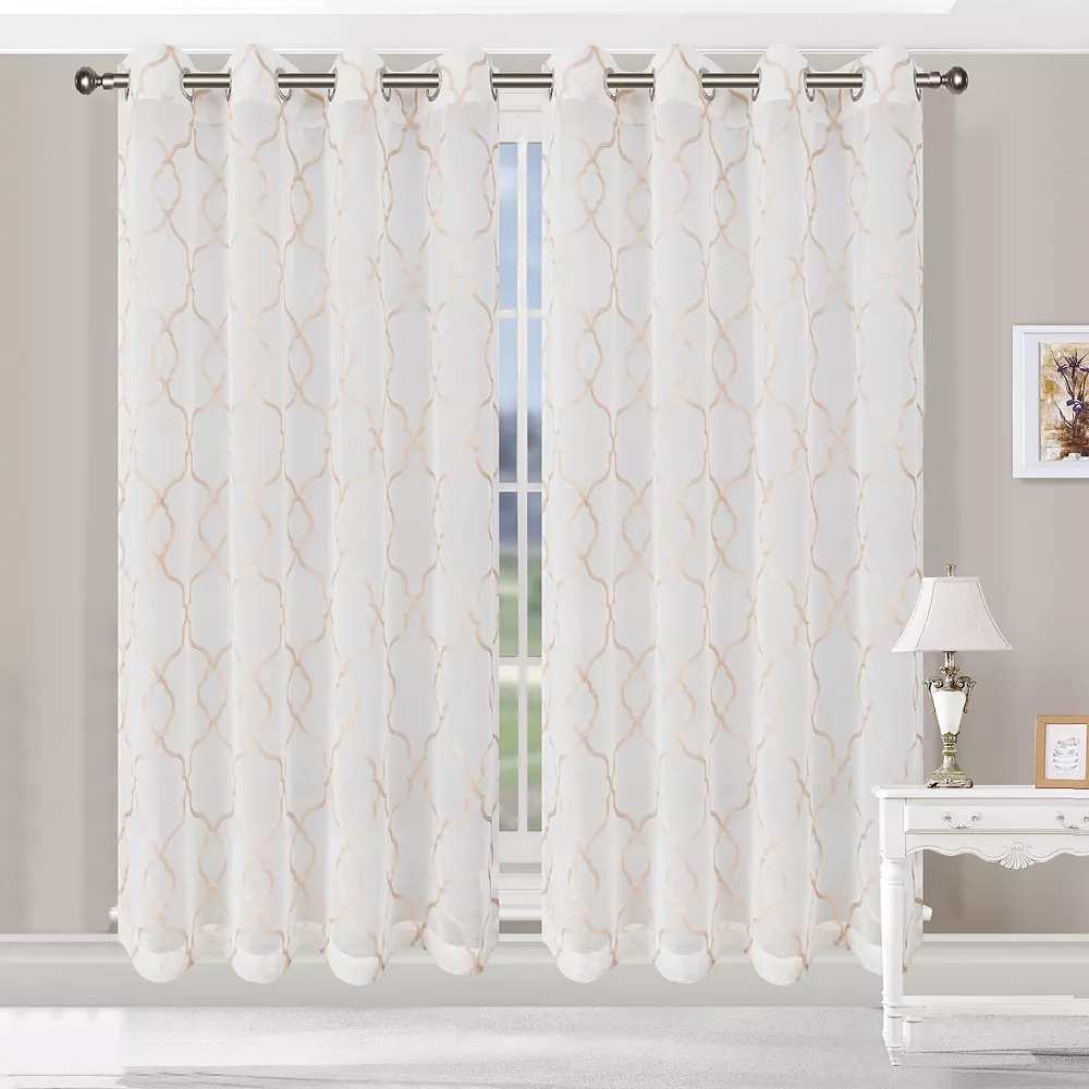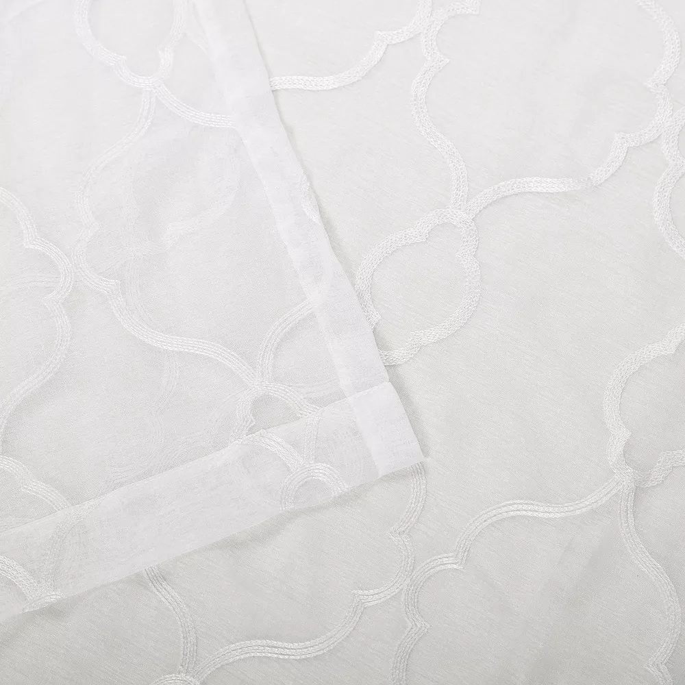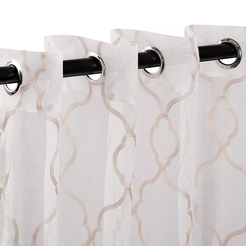 - Update the look of your windows with the Lattice Embroidered Sheer Curtains. This Moroccan-inspired lattice pattern will decorate your favorite space with understated elegance. Crafted from polyester with a stainless grommet header, this panel duo is durable and modern in design. Semi-sheer curtains mingle well with almost any interior and fit in nicely with bold to soft color patterns. This exquisite set is sure to become a highlight in your home that you’ll enjoy.